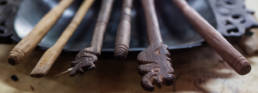Deux sticks surmontés de divinités sculptées, un complété par une aiguille, l'autre qui sert de marteau : voici les seuls outils des tatoueurs Ibans. Cliff, artisan tatoueur passionné par les méthodes traditionnelles de tatouage, les fabrique sur demande dans son studio de Kota Kinabalu.