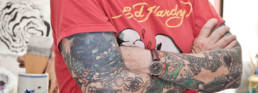 Quand j’avais 10 ans je venais y observer les tatoueurs et Lyle s’occupait d’un shop pour Bert ; c’était très modeste, ça ressemblait à un couloir mais avec une grande enseigne. Et je m’en souviendrais toujours parce que c’est le premier que j’ai vu avec les avant-bras découverts et entièrement tatoués. Un jour, alors que je le regardais, il m’a carrément renvoyé en me disant: « Dégage, tu dois avoir 18 ans ! ».