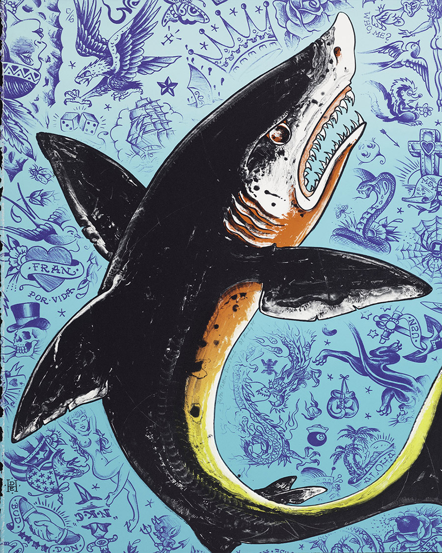 J’ai alors travaillé de façon totalement libre et inconsciente, sans aucun planning en tête, sur des dessins àl’acquarelle, manipulant le pinceau et laissant les choses arriver. J’ai une mémoire musculaire héritée des milliers de dessins que j’ai réalisés et naturellement ces motifs sont remontés. C’était intéressant de voir que tous ces mouvemenst et ces formes faisaient partie de moi et de mon inconscient. C’était une libération personnelle. Puis j’ai commencé à mélanger et reconfigurer cette imagerie classique du tatouage américain. Pour moi c’est un peu comme composer une chanson, écrire un livre, je peux prendre des éléments épars et les associer de façonà les détourner. C’est une sorte de poésie visuelle, connecter ces choses produit une œuvre nouvelle et inédite. Aujourd’hui, cela me rend heureux.