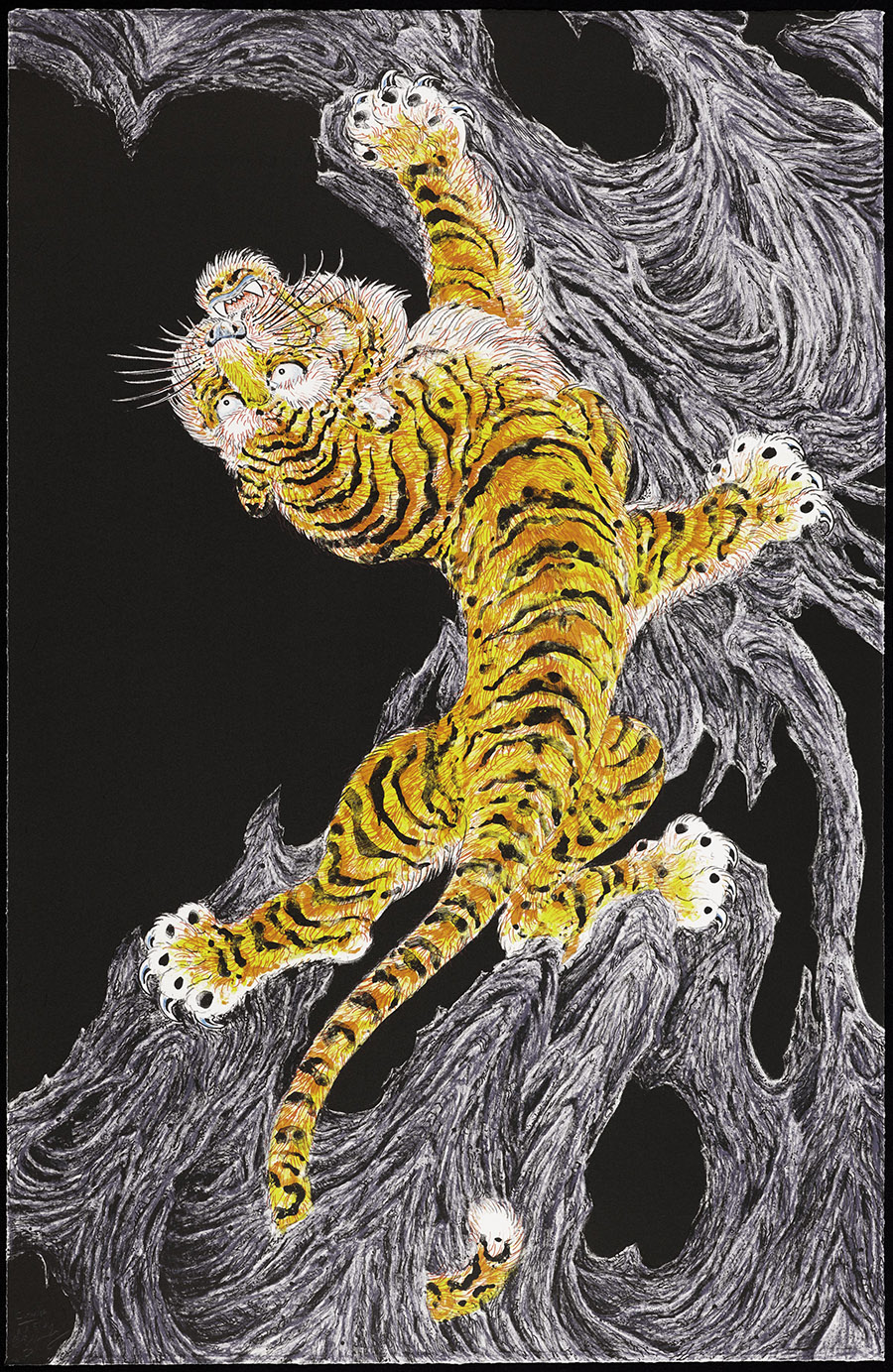 Quand j’ai déménagé à Honolulu, j’ai eu le temps de réfléchir clairement à l’art que je souhaitais faire. En même temps je m’étais imposé une règle : « Cela ne doit ni fonctionner comme un tatouage, ni utiliser aucune référence à celui-ci ».Cela m’a désespéré. Que pouvais-je bien faire ? J’ai commencé des peintures avec des représentations de gorilles et puis je me suis dit: « C’est stupide, c’est une limitation, cela fait partie de ma vie et cela peut être n’importe quoi ».