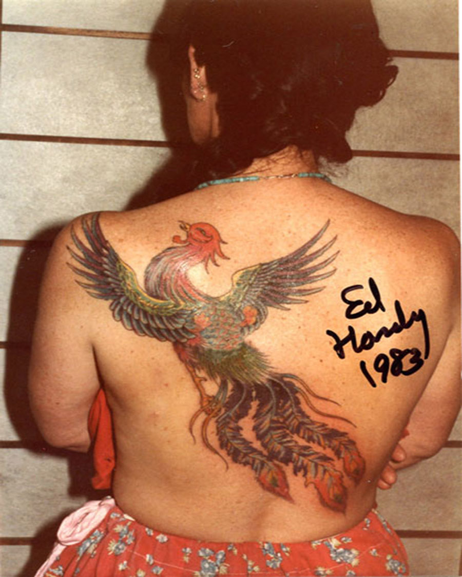 Grâce à Dennis. Son shop était dans un quartier huppé, avec beaucoup de bourgeois, de jeunes branchés. C’est là-bas qu’il a tatoué les Stray Cats, Steve Jones des Sex Pistols, entre autres. Je me faisais tatouer par Dennis et je traînais à son shop quand les photos du travail réalisé par Ed Hardy ont commencé à circuler. C’était incroyable. Un jour Dennis m’a appelé au téléphone pour me dire : « Ed va venir. Vient le rencontrer et si tu veux te faire tatouer par lui on organisera un rendez-vous ». C’était en 1980. Je lui ai demandé de me faire une punk-rockeuse, il était très enthousiaste à l’idée de faire ce motif.
