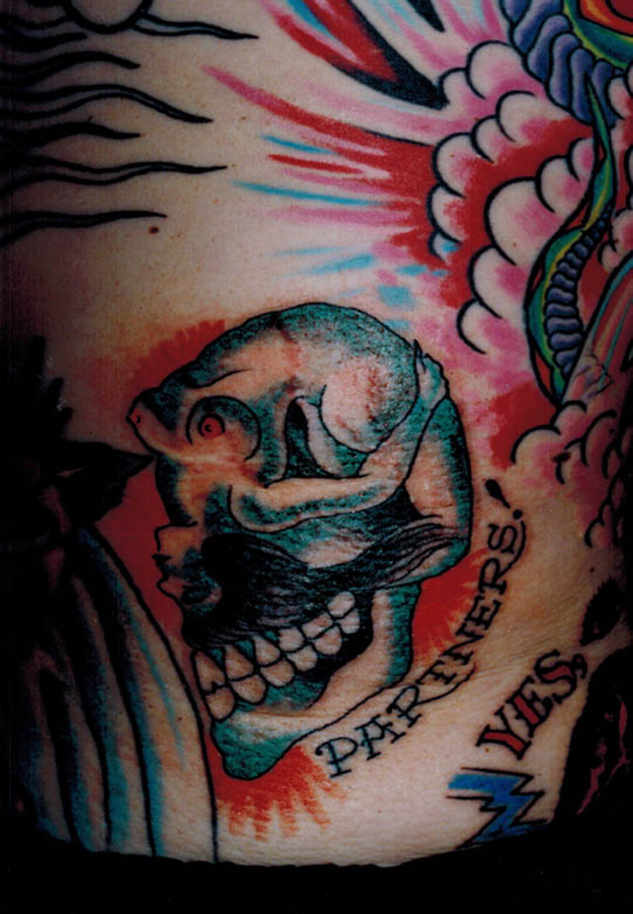 A l’époque, si tu venais chez Jock pour lui demander le crâne d’Exploited, il te répondait : « Mais bordel de quoi parles-tu ? ». Il avait ce qui était placardé sur ses murs, point final. Dennis Cockell l’aurait fait parce qu’il repoussait les limites, depuis son retour des Etats-Unis. Mais à la même époque, quelques tatoueurs comme -l’excellent- Ian de Reading et moi-même, nous travaillions nos propres designs. Quand on est jeune on veut faire des choses, être enthousiaste.