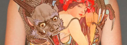 Alphonse Mucha est un peintre, affichiste et illustrateur d’origine Tchèque de la fin du 19e et du début 20e siècle. C’est en réalisant les affiches des spectacles de Sarah Bernhardt qu’il trouvera la célébrité et deviendra par la suite l’artiste le plus reconnu de l’art nouveau. Ses dessins, avec des lignes soutenues et des ornements en background s’accordent avec brio ( avec qui ?) au tatouage. Le tatouage, pour résister aux années et aux soleil, a besoin de contraste et de lignes nettes. Mucha devient une vraie source d’inspiration pour les artistes tatoueurs. Et les nombreuses oeuvres présentées lors de cet événement le prouvent.