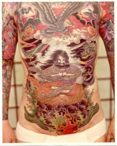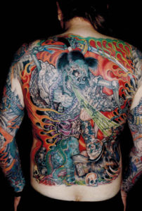 C’est devenu un sujet épineux quand je suis parti au Japon. Chez Oguri sanma tâche consistait à passer derrière lui, une fois qu’il avait effectué les tracés, et faire les remplissages. Un jour j’ai commencé le dos d’un de ses clients avec une couleur que j’avais préparée. Quand il est revenu Oguri san m’a fait remarqué qu’elle n’était pas exactement la même: « Tu ne peux pas changer les couleurs, le client veut qu’elles soient plaines et uniformes. » Et il avait raison. J’avais l’habitude de faire mes couleurs pour des petits tatouages finis en une séance mais pas celle pour des grandes pièces comme ils les faisaient au Japon.