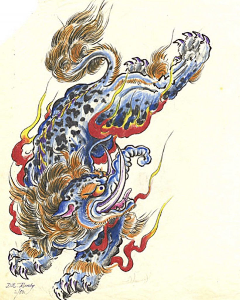 Les tatoueurs ont acheté mes dessins au fil des ans et j’ai pensé qu’ils pourraient être intéressés de voir dans un livre comment les choses se sont développées. Certains dessins ont été faits quand j’avais 3 ans, il y a aussi des gravures qui datent de ma période universitaire, des travaux dans le style japonais ainsi que l’illustration du processus de réalisation d’un tatouage, depuis les études jusqu’au dessin définitif. Des dessins comme ceux-ci j’en ai des centaines et de quoi faire 4 ou 5 livres.