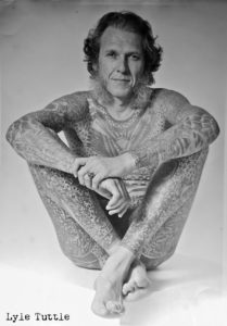 J’ai essayé d’évoquer avec lui le passé et d’anciens tatoueurs américains mais la conversation sortait inévitablement du sujet. A l’époque il prenait beaucoup de speed et j’ai fini par me dire que je ne pouvais pas passer ma vie à attendre ces choses qui m’intéressaient ! Il ne le faisait pas de façon intentionnelle, il planait tout simplement ! Plusieurs fois je lui ai dit qu’il serait pourtant essentiel de faire un livre sur sa vie, ce à quoi il répondait invariablement: « Je l’ai déjàvécue, je n’ai pas besoin de la raconter encore une fois ! » C’est vraiment dommage parce qu’il a toutes ces histoires, que personne d’autres ne connaît et qui remontent si loin. Lyle a commencé dans les années 1940 je pense.