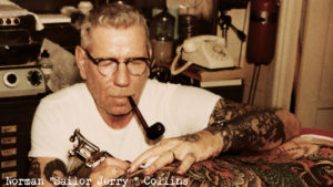 Parce qu’il parlait aux médias. Il n’y a jamais eu un seul article sur Jerry, pas plus une interview : il jetait les gens dehors. A cause du mépris qu’avaient les gens envers les tatoueurs, ils restaient entre eux et ne voulaient parler de rien et à personne. Jerry qui avait fait des recherches approfondies sur les pigments mentait également aux gens quand à leur provenance pour en conserver le secret. Chris Nelson, un ancien employé de la marine marchande, tatouait dans une salle de jeux proche de l’endroit où travaillait Lyle. Nelson avait ce sac en papier à côté de lui quand il tatouait.
