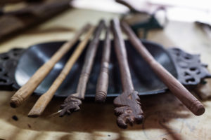 Two sticks topped with sculpted deities, one completed by a needle, the other used as a hammer: here are the Iban tattooers’ only tools. Cliff, craftsman tattooer, passionate with traditional tattooing methods, makes them upon request in his Kota Kinabalu studio.