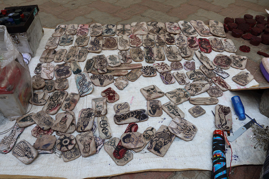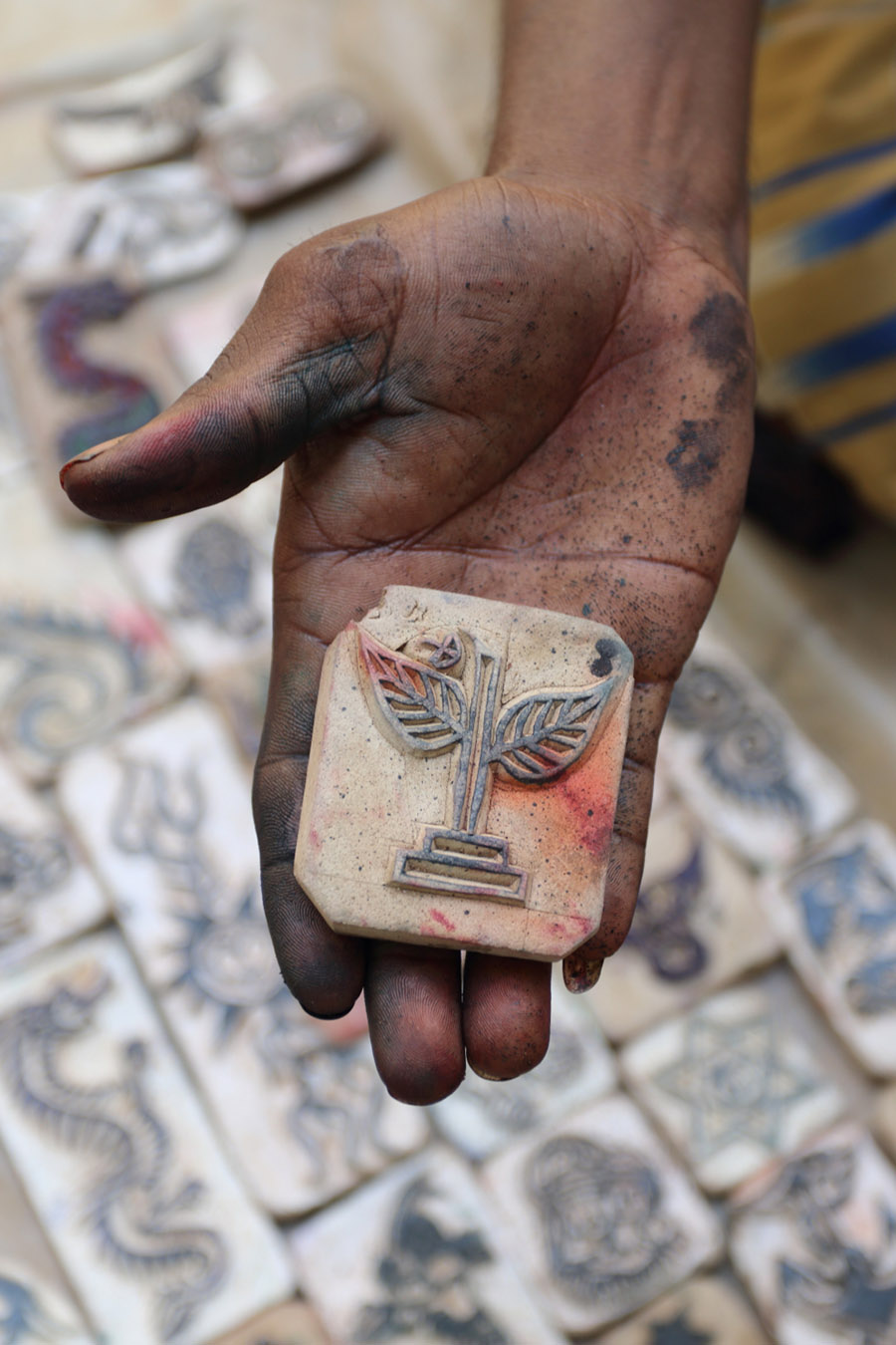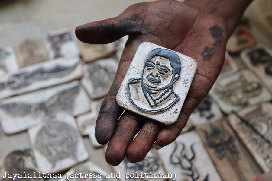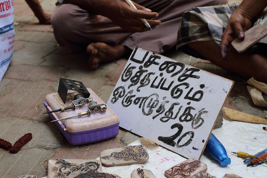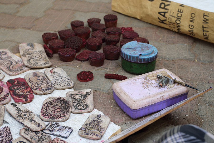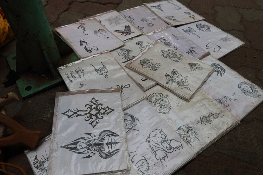 Juste devant la porte principale du temple, une famille de tatoueurs itinérants a répandu sur le trottoir ses tampons en bois sculptés à la main : icônes religieuses, motifs tribaux, emblèmes de partis politiques, visages d’acteurs et de sportifs. Les tatoueurs de rue font partie d’une communauté nomade qui peut être assimilée aux gitans du sous-continent. Dans les campagnes, ils exercent encore la profession de charmeur de serpent et vont de village en village offrir leurs spectacles.