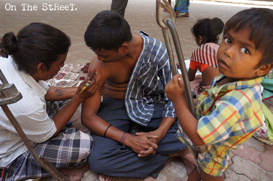 Le jeune marié Navaneetha veut se faire tatouer le nom de sa femme, Jothi, sur la poitrine. Il est accompagné par ladite Jothi, venue apporter son soutien moral. Cinemaguru, son frère Jagannath et son cousin Cinemani, travaillent sur les trottoirs du pays depuis des années. Au stand d’à-coté, la sœur de Cinemaguru propose des menhdi, tatouages temporaires ornementaux au henné. Traditionnellement obtenus à partir d’une pâte végétale, ils sont de plus en plus composés de colorants chimiques qui brûlent la peau mais restent incontournables pour être la plus belle pour aller danser aux mariages.